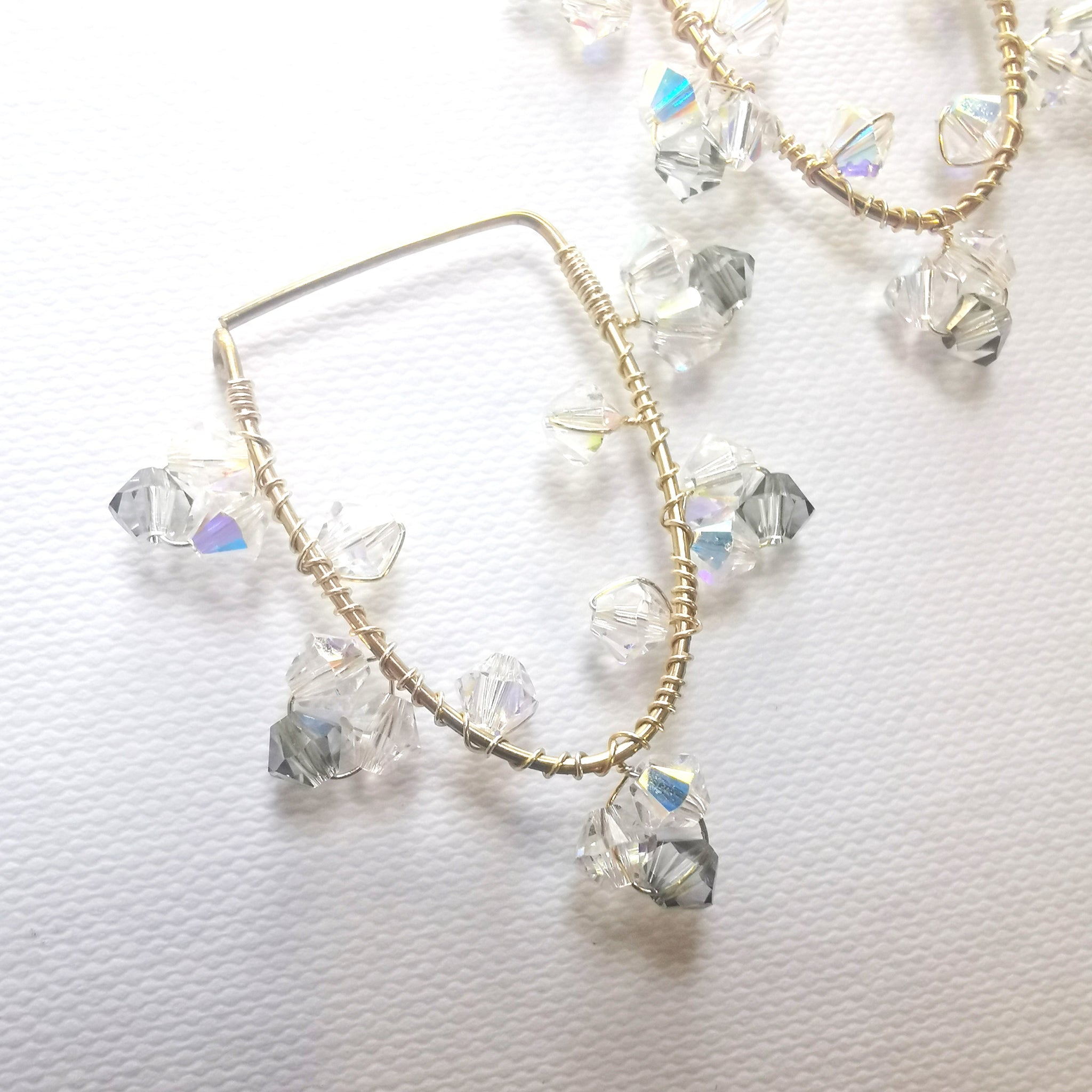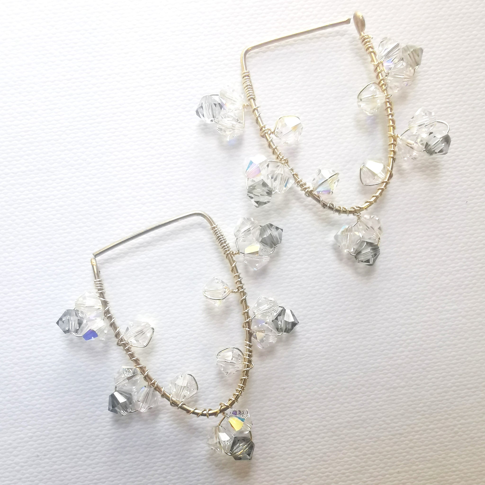 This stunning earrings is made of dual transparent and light grey Swarovski entwined around the non-tarnish brass wires. Suitable for dressing up or down for any occasion.