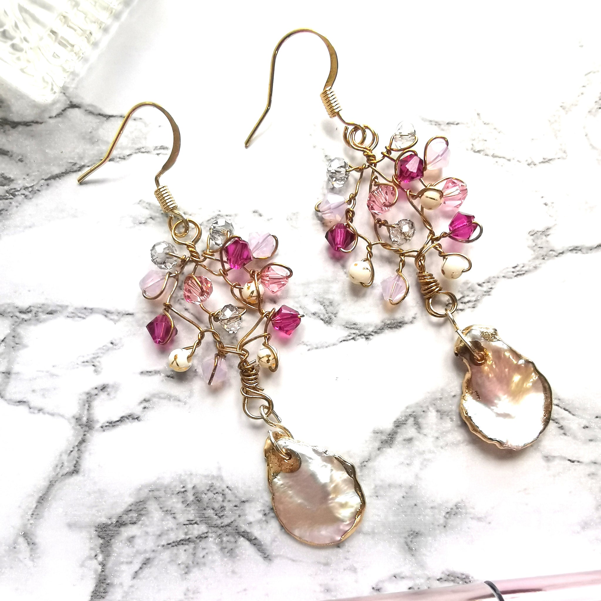 This unique creation is made of various tones of pink and maroon Swarovski crystals and beads entwined around non-tarnish brass wires.