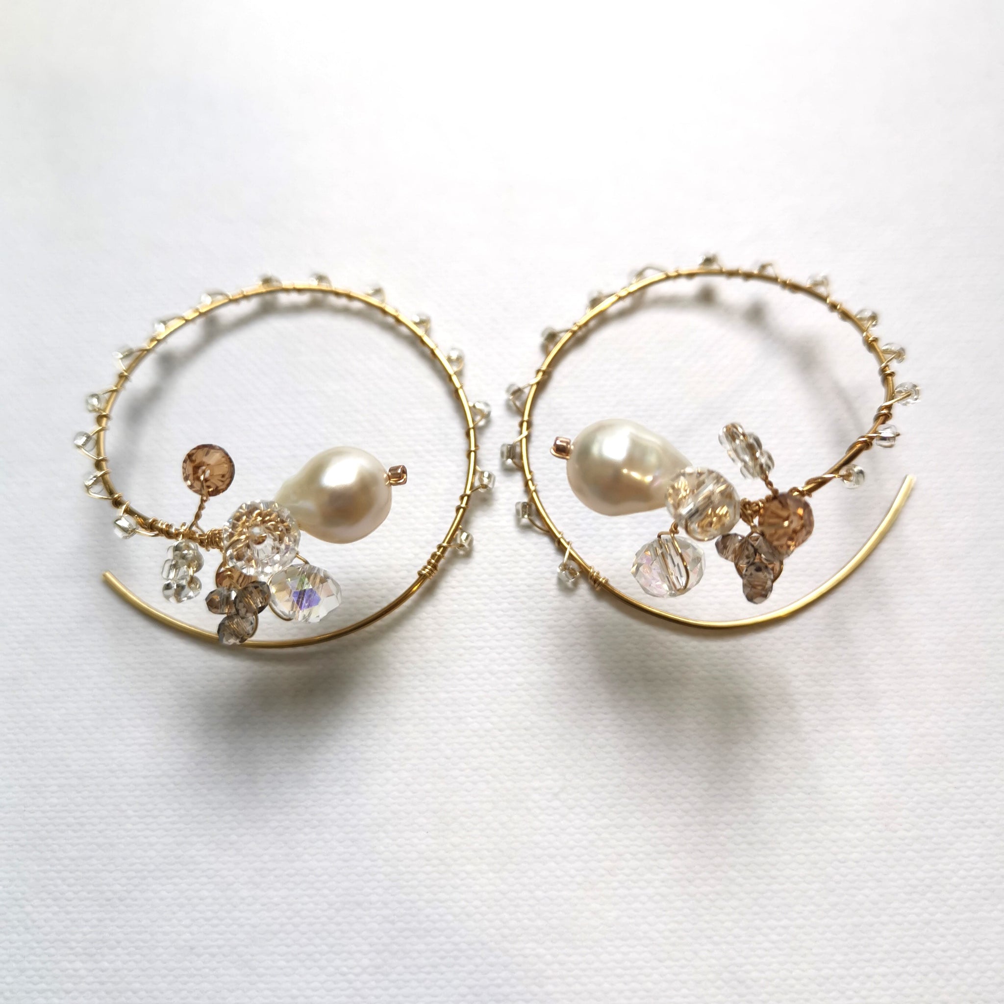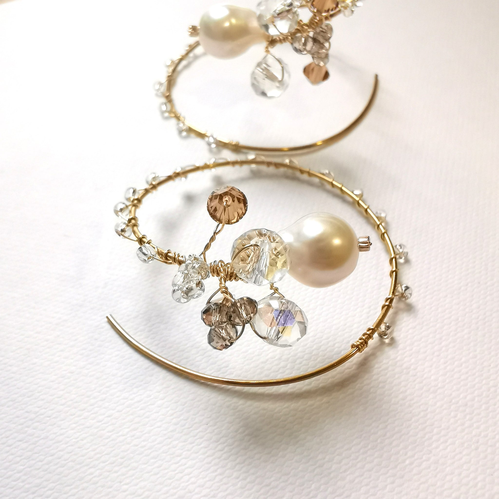 Made of teardrop freshwater pearls in beige with various tones and sizes of transparent, light grey, and brownish tones glass beads and Swarovski entwined around non-tarnish brass wires.