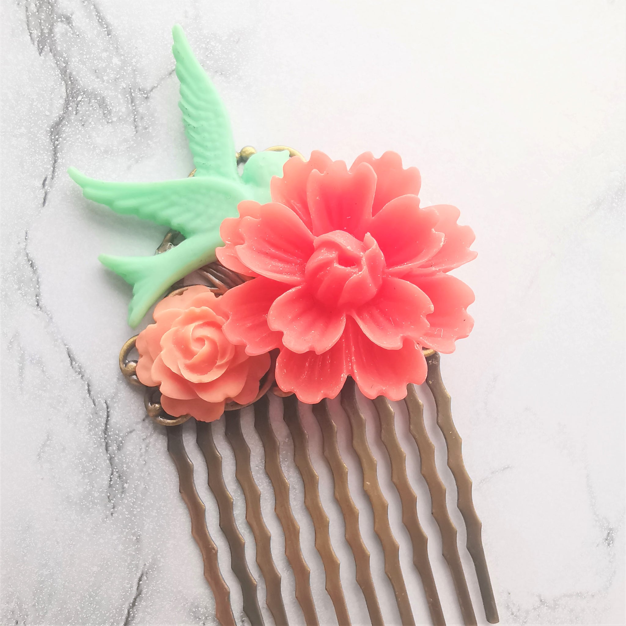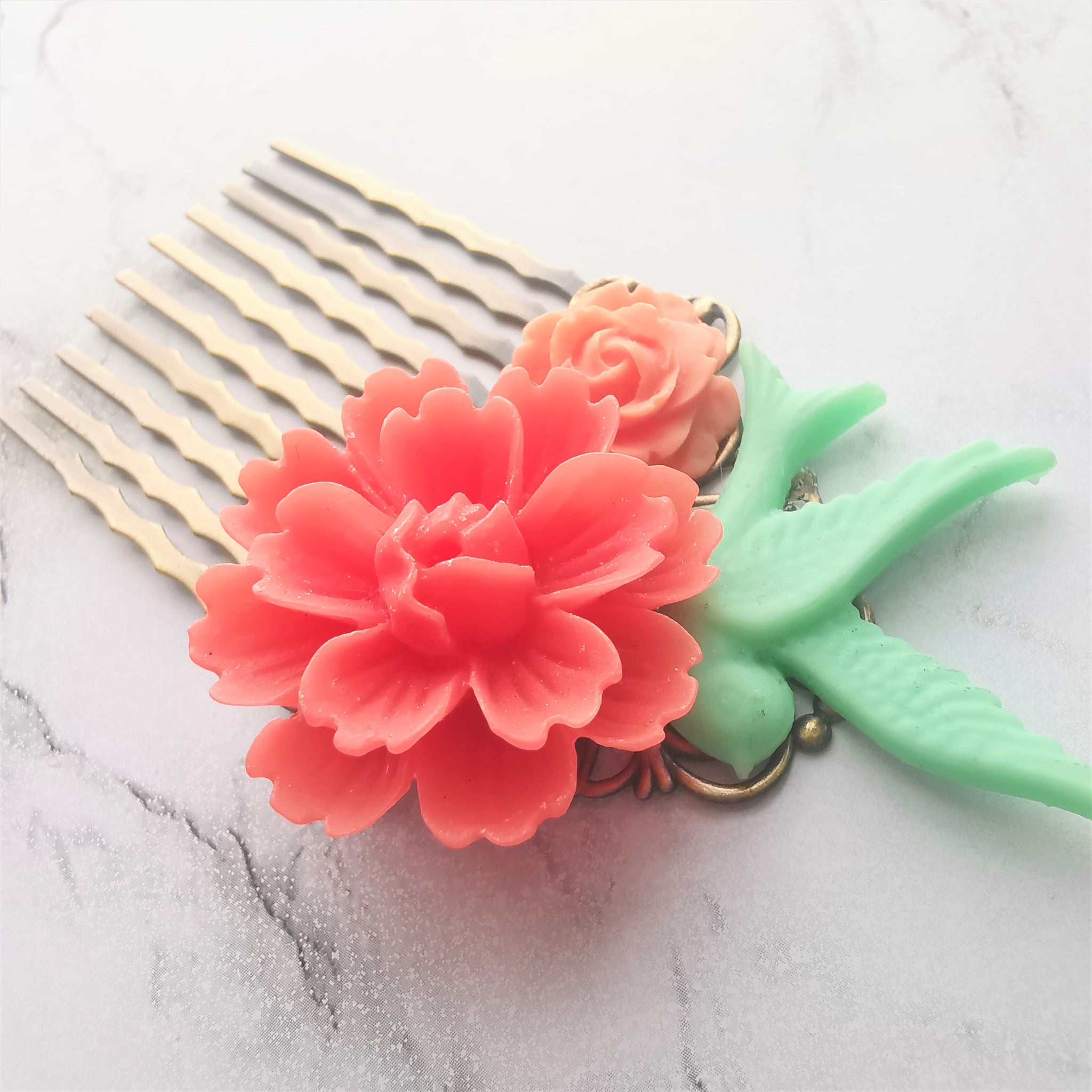 Antique brass finish hair comb pin made of orange pink sakura cabochon with pink rose cabochon and sea green bird cabochon. All cabochon is made of resins.