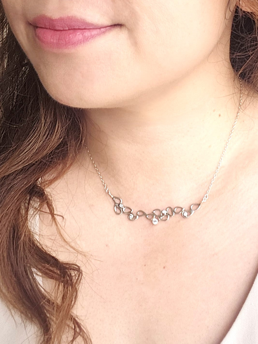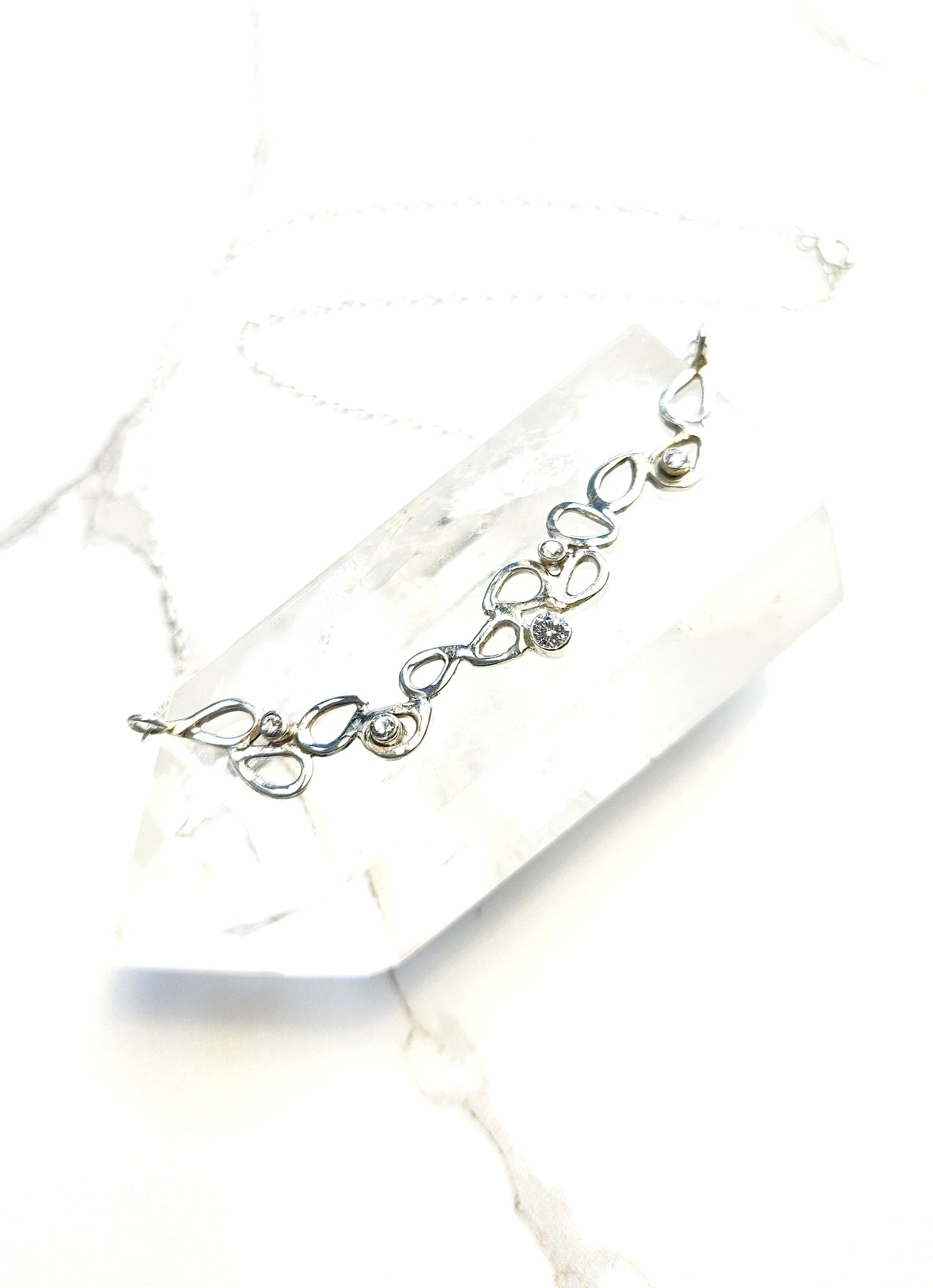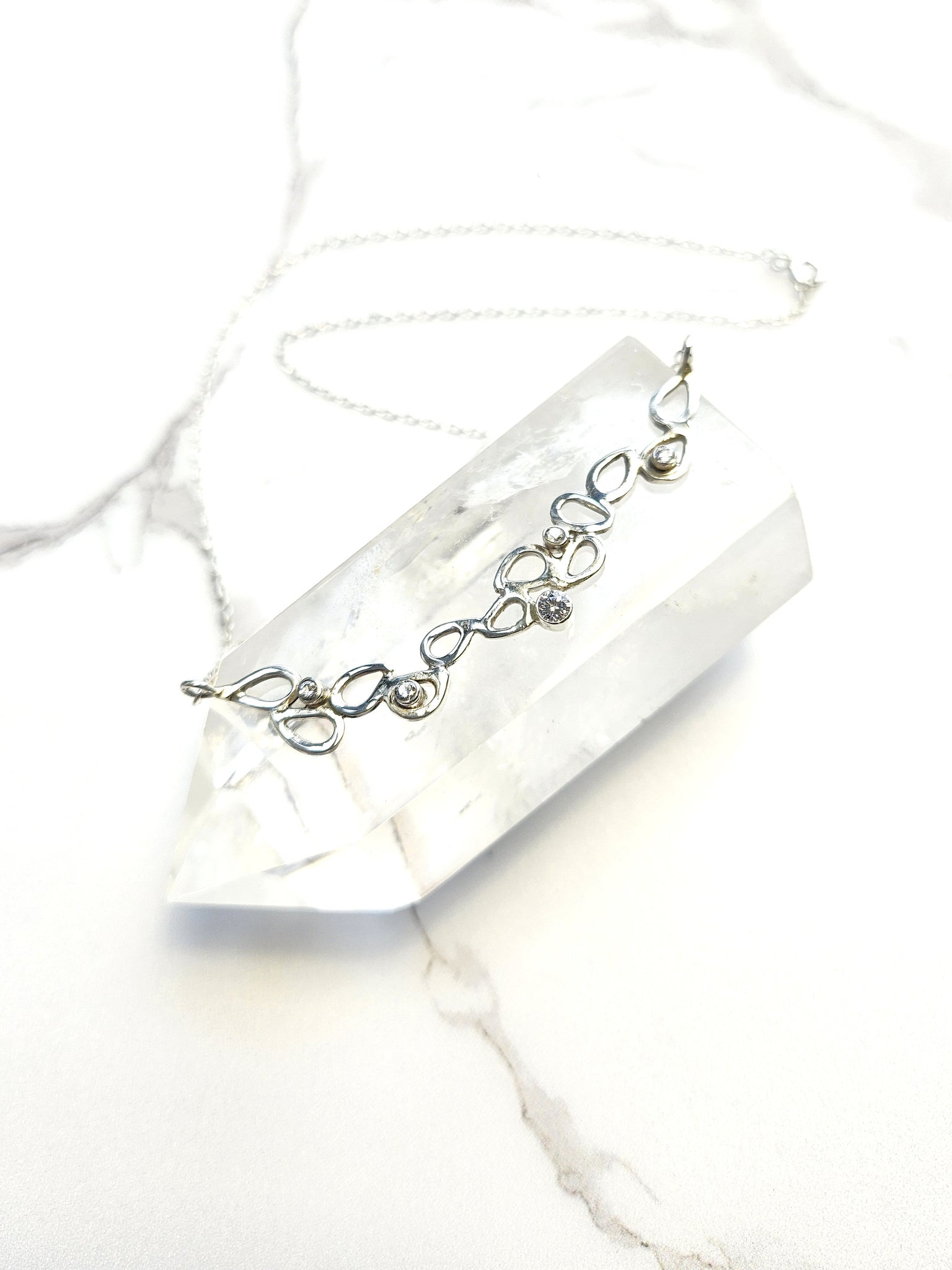 From the Graines de Tournesol Collection comes the Arc de Lumière Pendant (also known as Arc of Light), a graceful expression of light captured in motion. Crafted in sterling silver, its elongated silhouette reflects the soft curve of a sunbeam bending through the sky — a moment where light flows, lingers, and returns with gentle radiance.