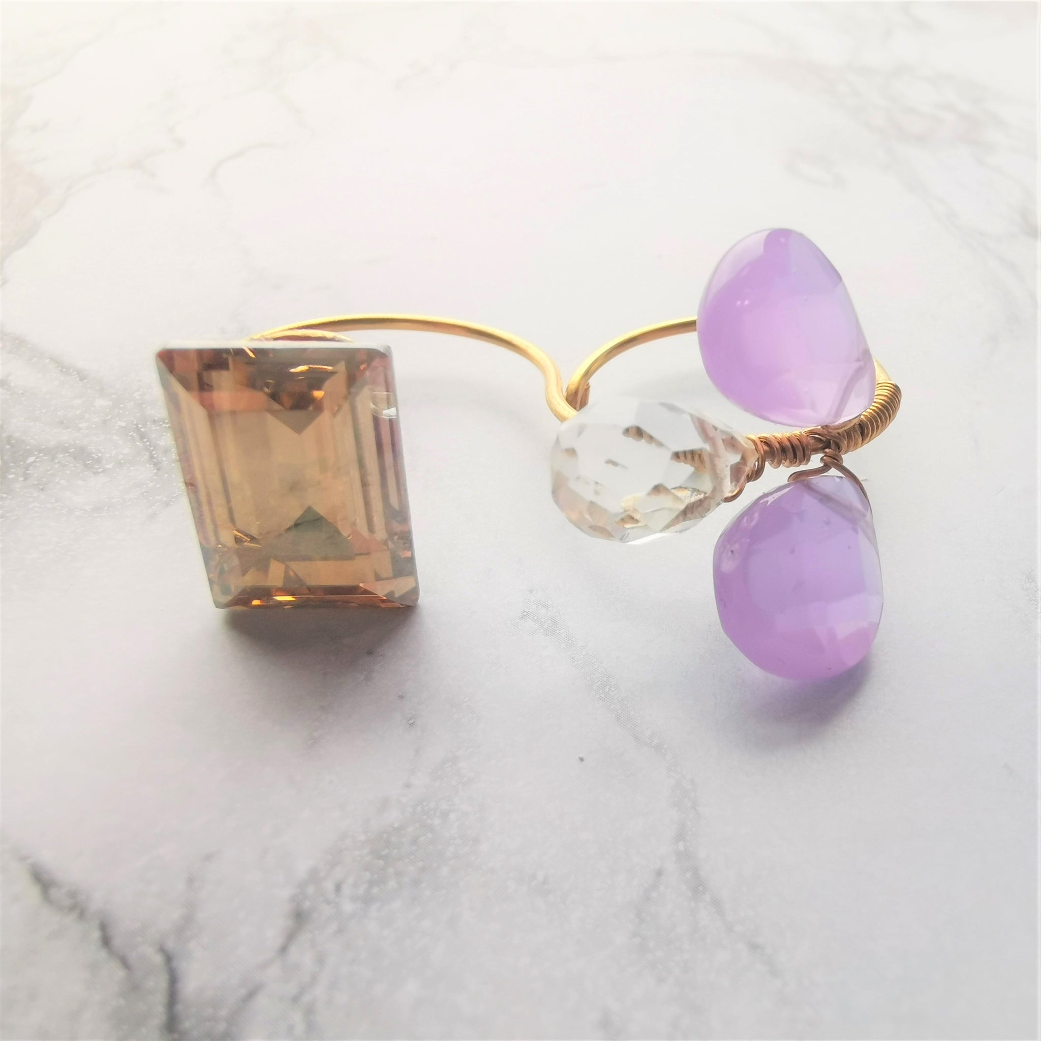 Handmade rings made of emerald cut in golden brown swarovski and lavender and clear teardrop glass crystals entwined with non-tarnish gold wires. Adjustable rings.
