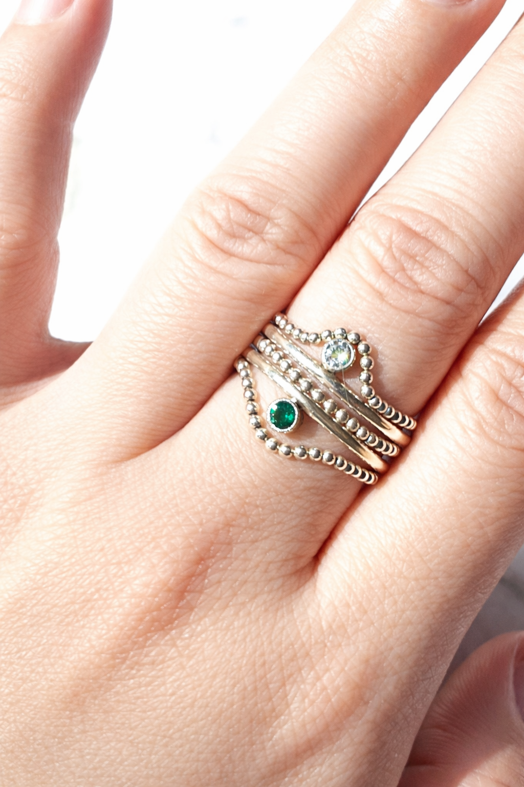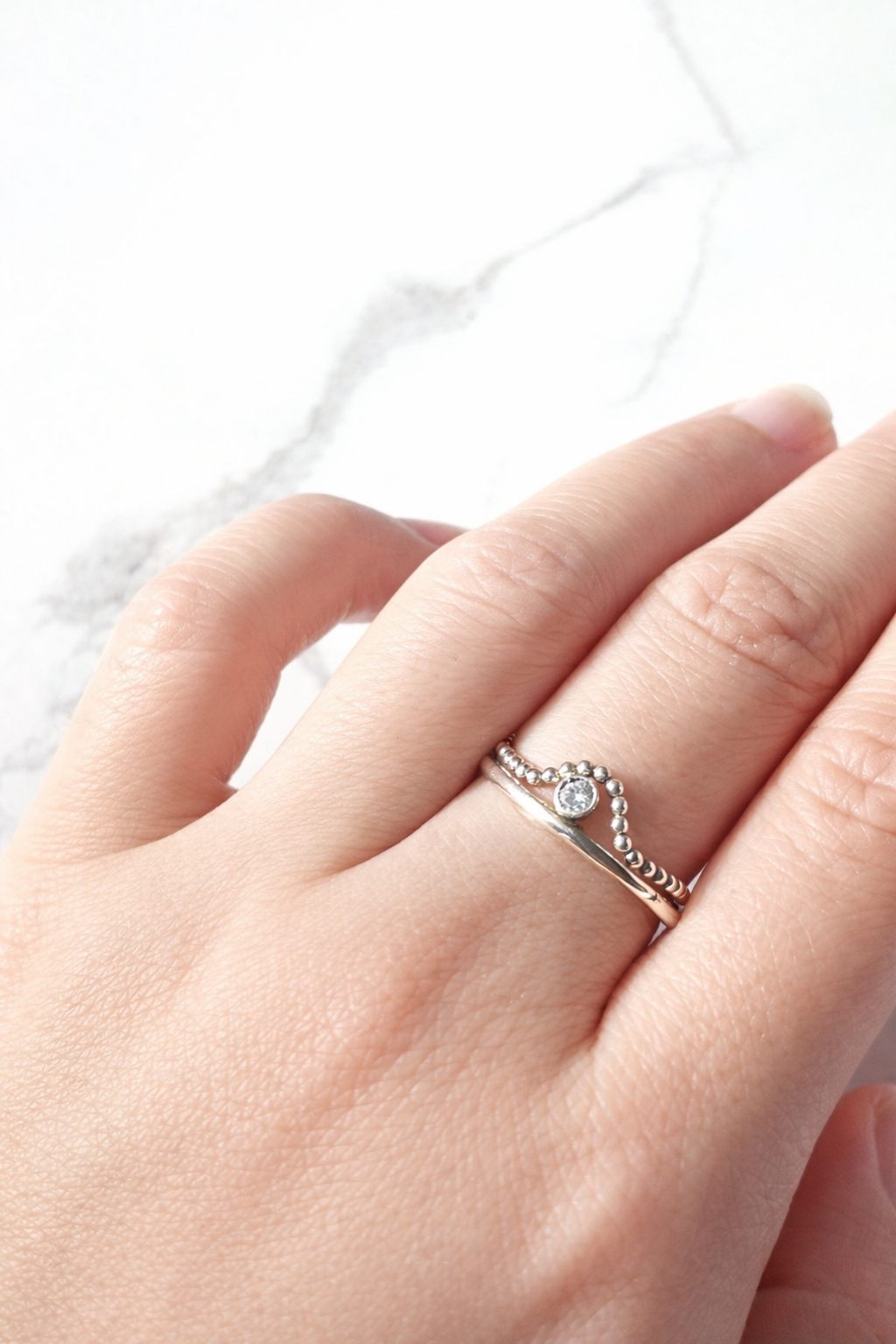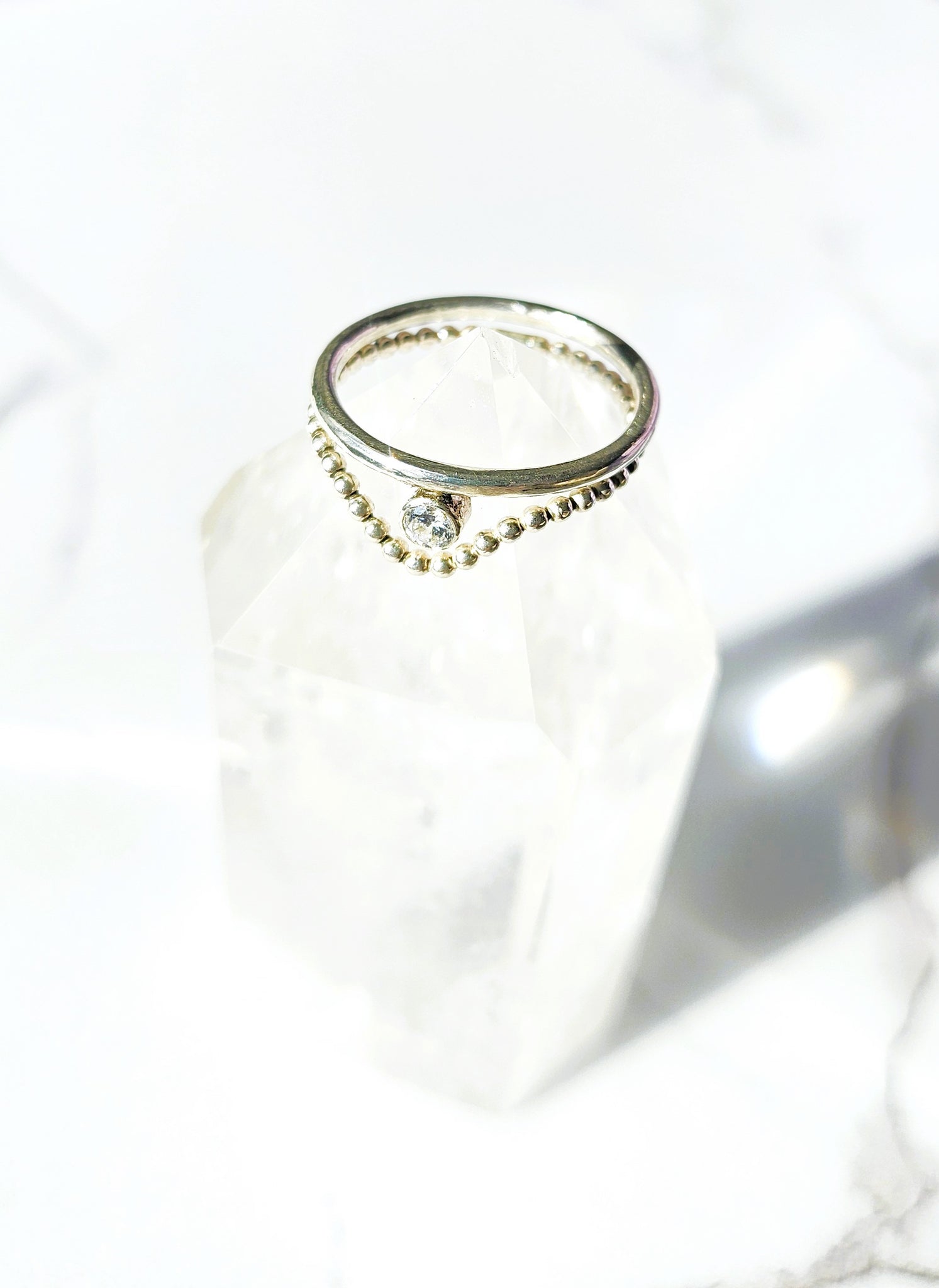 Handcrafted in sterling silver, the ring features a single clear Preciosa Czech crystal, chosen for its clean brilliance and quiet sparkle. Minimal in form and refined in detail, the design allows light to move freely through the crystal - subtle, balanced, and effortlessly elegant.