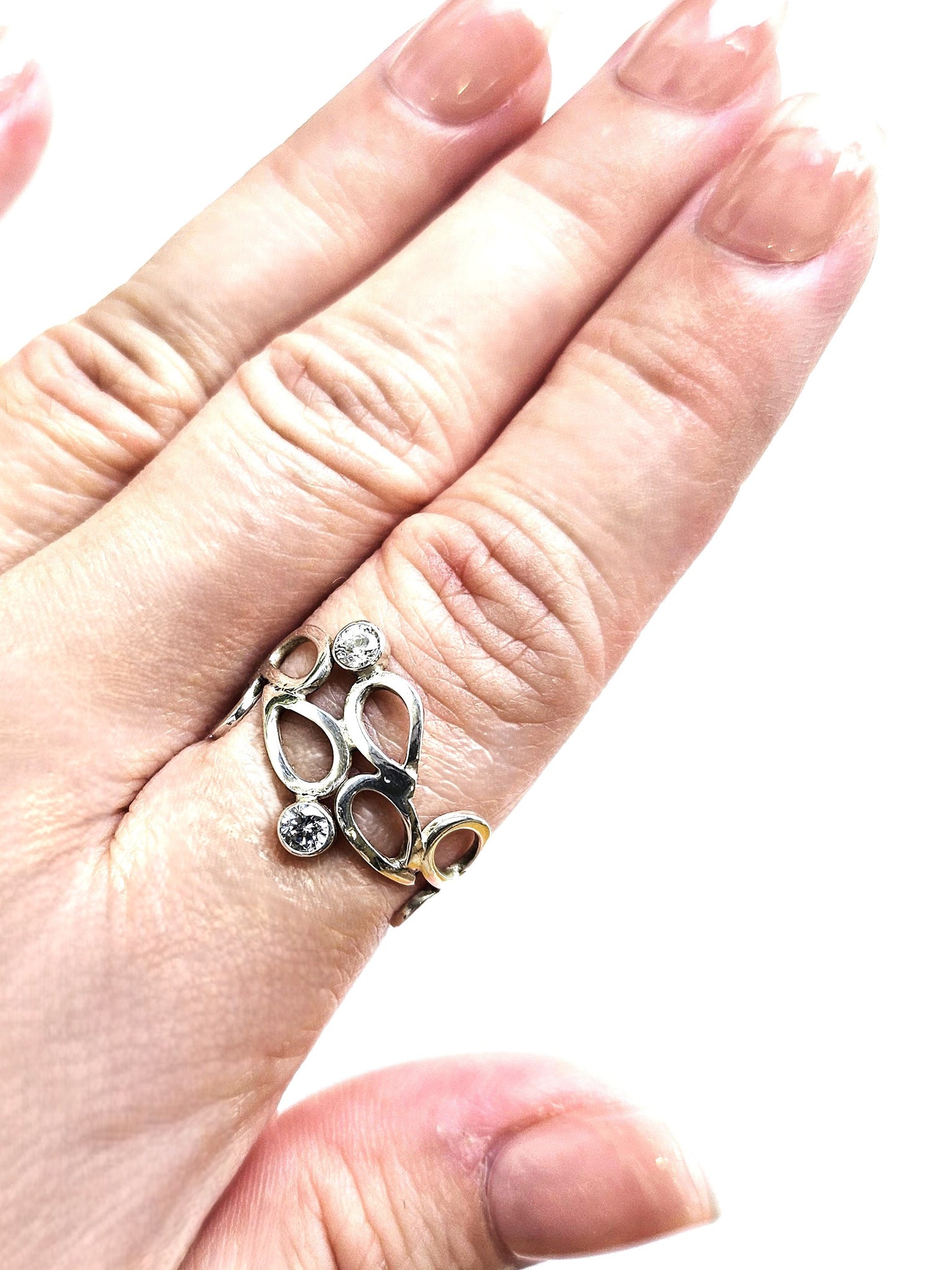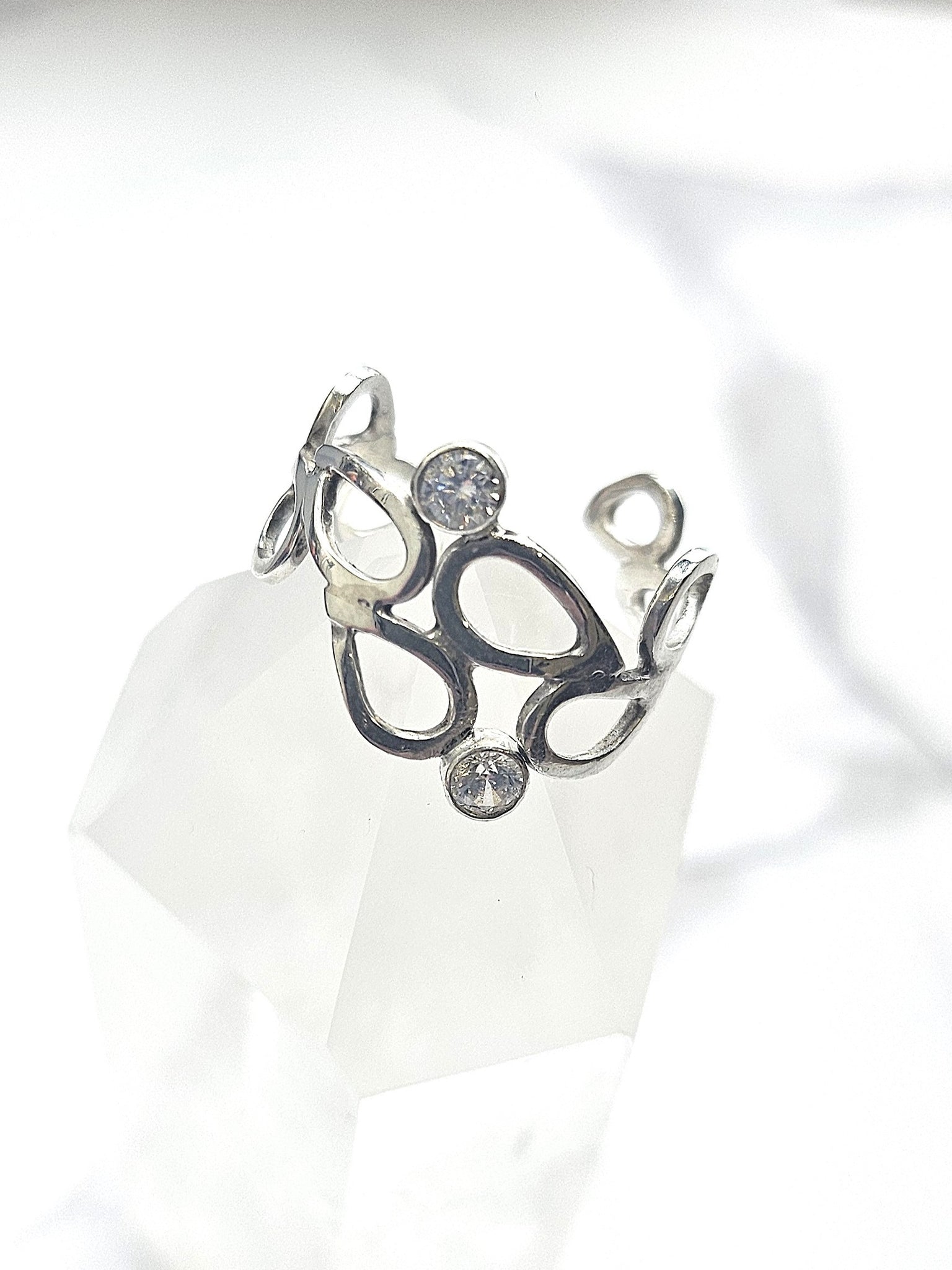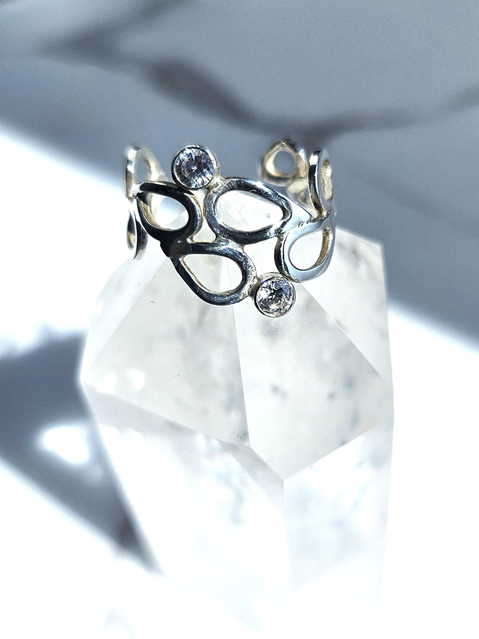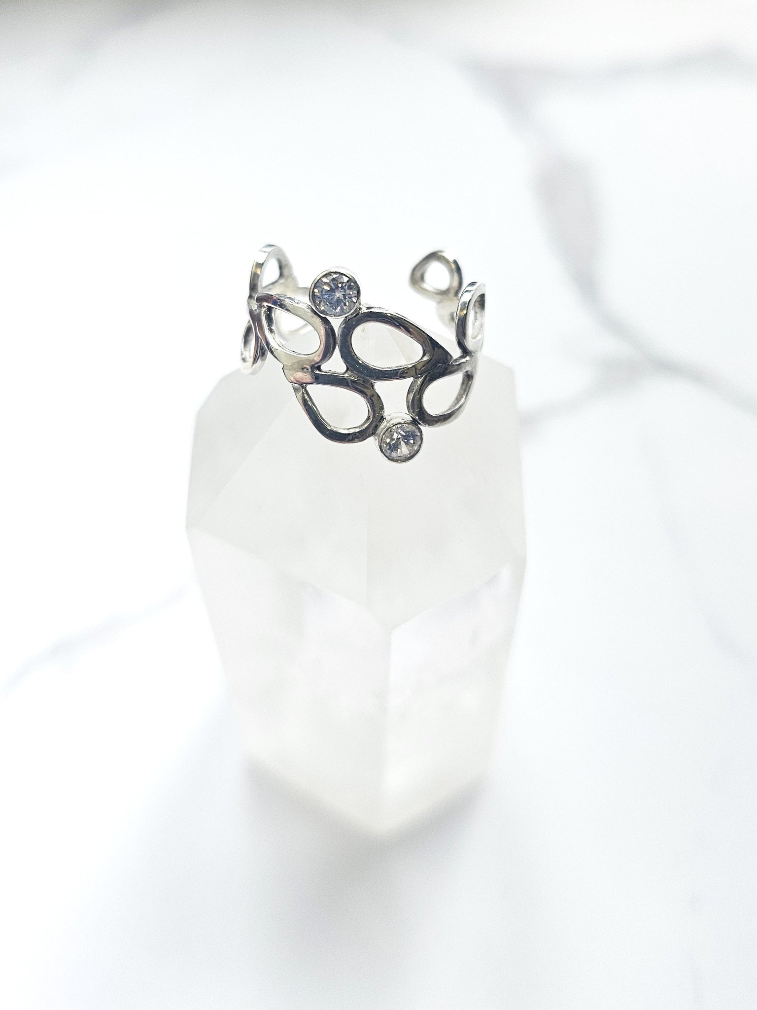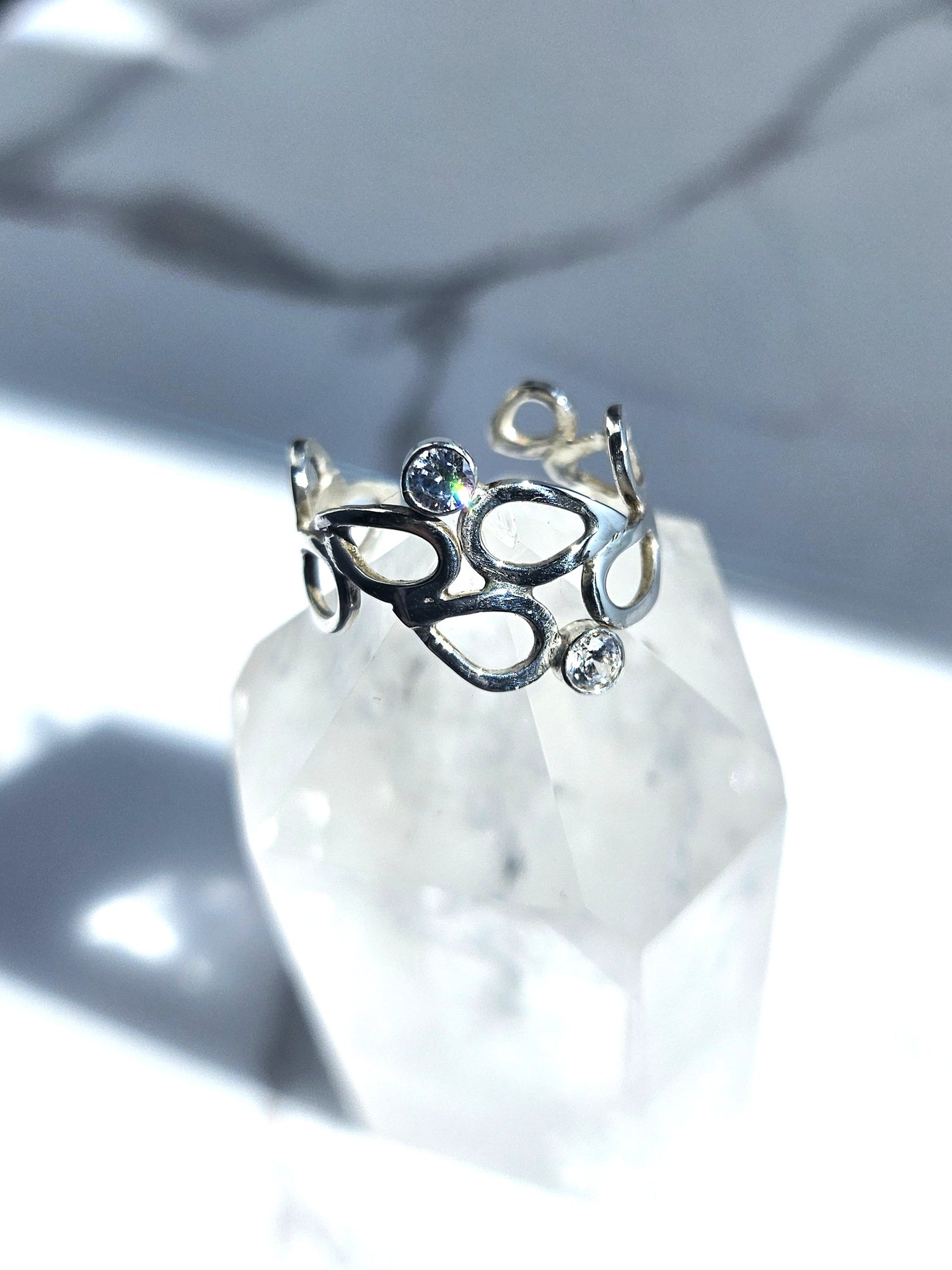 This sterling silver ring, with its sunflower seed shape and radiant crystals that represent water droplets, exudes timeless elegance. It's a piece that adds a touch of sophistication to any outfit —a sunflower seed reimagined in your hands.