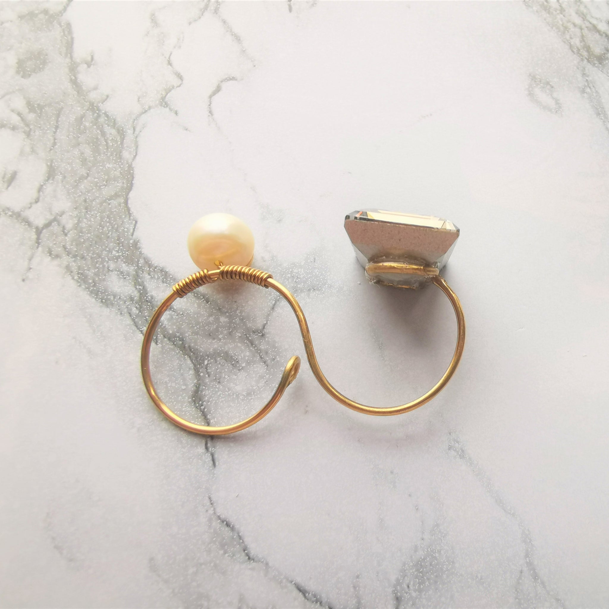 Handmade rings made of emerald cut in dark grey swarovski and beige freshwater pearls entwined with non-tarnish gold wires. Adjustable rings.