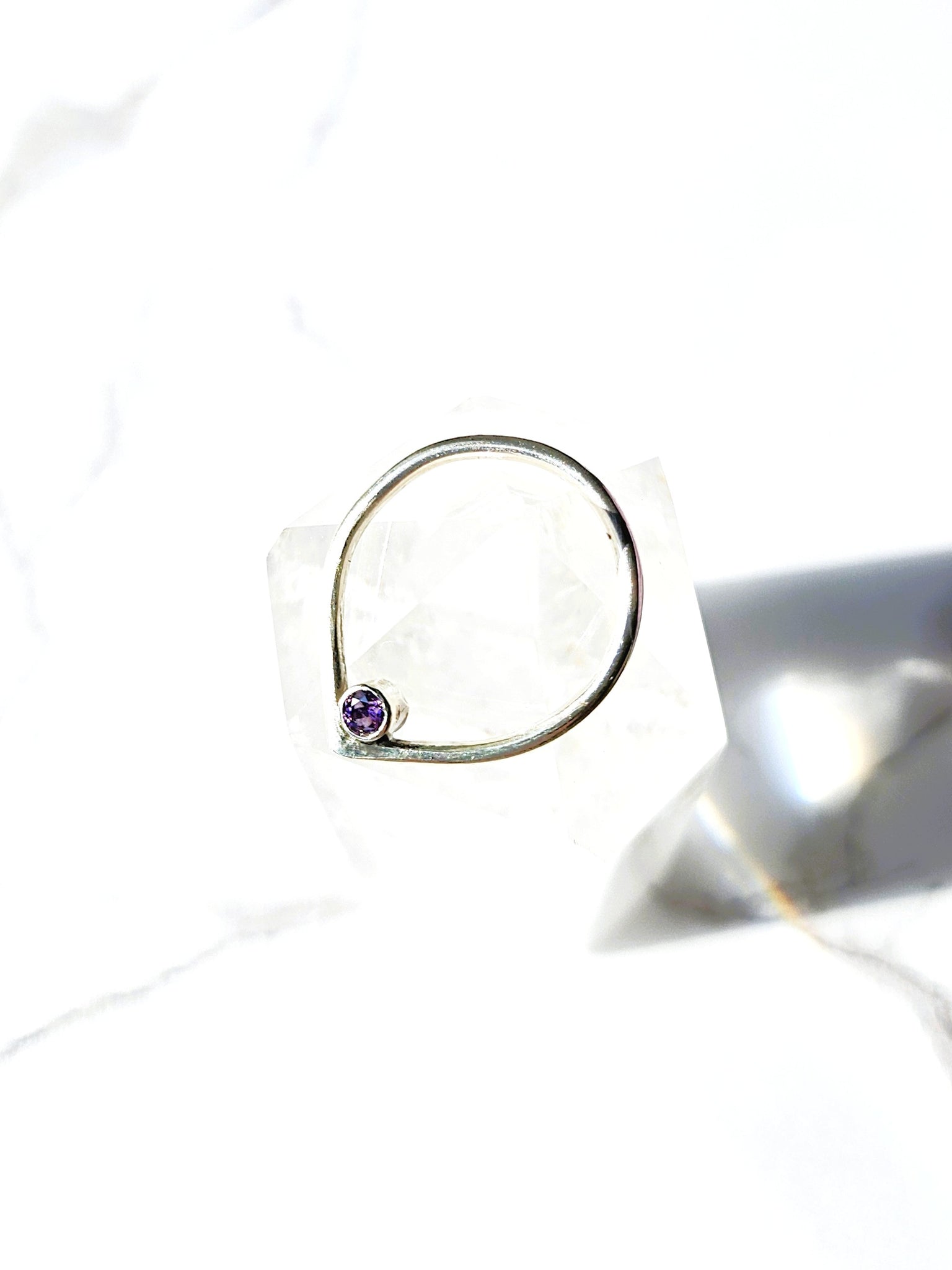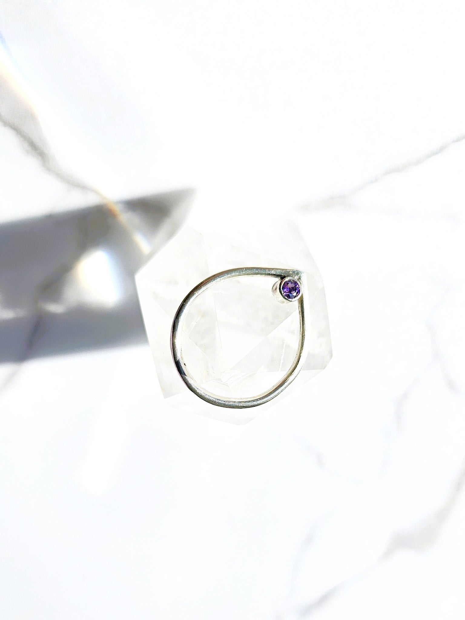 Handcrafted in sterling silver, the ring features a teardrop-shaped silhouette set with a purple Preciosa Czech crystal, chosen for its rich, luminous hue. The elongated form draws the eye gently upward, reflecting calm, intuition, and a sense of inward clarity.