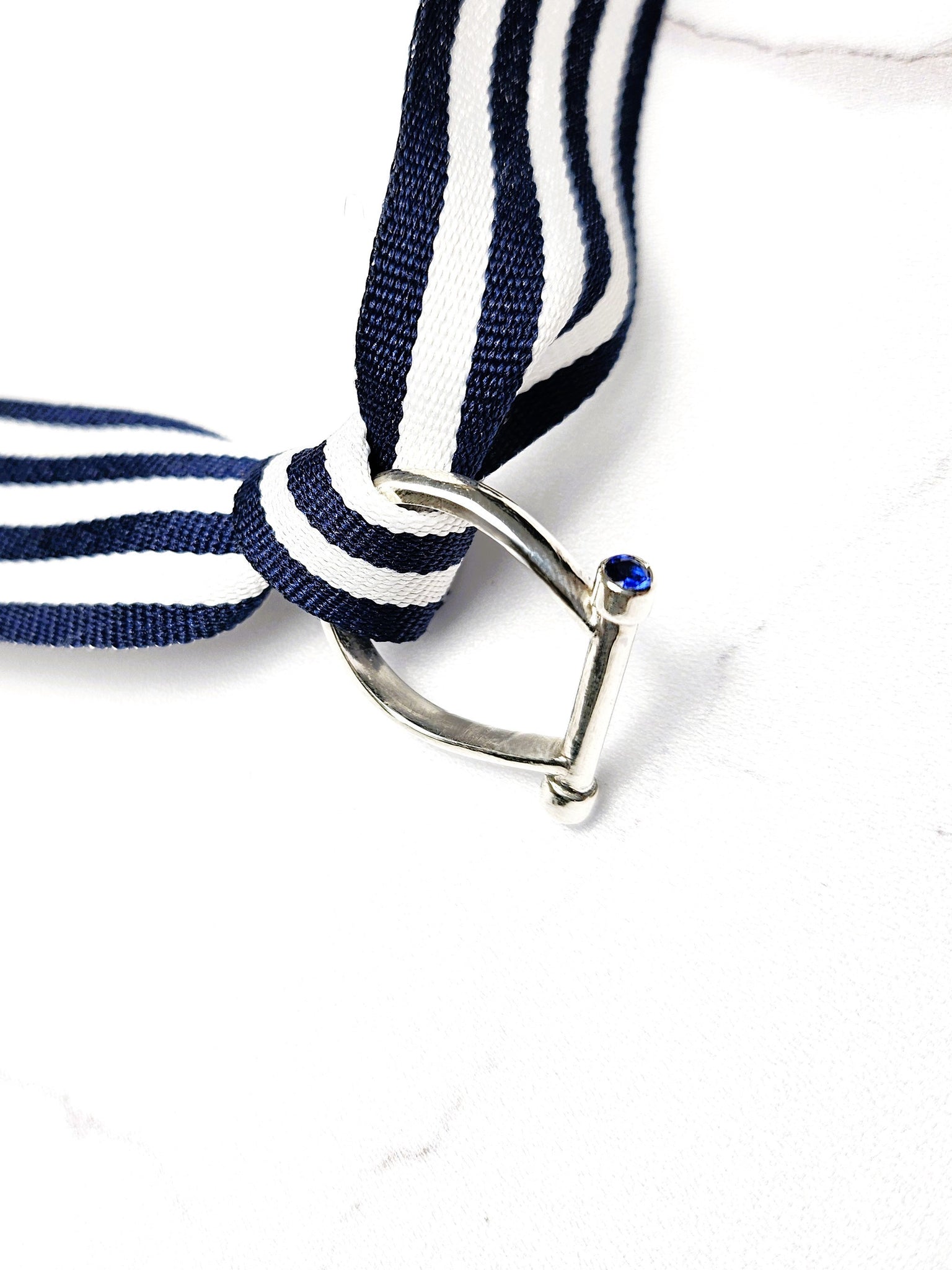 Handcrafted in sterling silver, this horse saddle stirrup-inspired ring is finished with two blue Preciosa Czech crystals set at both ends — like twin points of clarity that anchor the form. The cool, luminous hue evokes calm focus, inner harmony, and forward movement tempered by control.